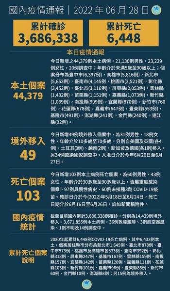 今日新增之44,379例本土病例,21,130例男性,23,229例女性,20例調查中;年齡介於未滿5歲至90歲以上;個案分布為臺中市(6,397例),高雄市(5,816例),新北市(5,653例),臺南市(4,145例,桃園市(3,521例),彰化縣(3,452例),臺北市(3,116例),屏東縣(2,053例),雲林縣(1,432例),苗栗縣(1,151例),嘉義縣(1,073例),新竹縣(1,069例),南投縣(999例),宜蘭縣(870例),新竹市(760例),花蓮縣(678例),嘉義市(647例),臺東縣(553例),基隆市(491例),澎湖縣(241例),金門縣(240例),連江縣(22例)。